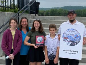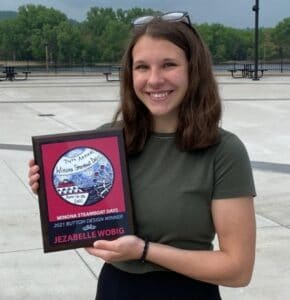 The Winona Steamboat Days Committee gathered Wednesday afternoon at Levee Park Plaza to unveil the 2021 Button Design and surprise the Designer. This year’s design winner is Jezabelle Wobig, daughter of Trevor and Heidi Wobig. Jezabelle is in the 10thgrade at Winona Senior High School.