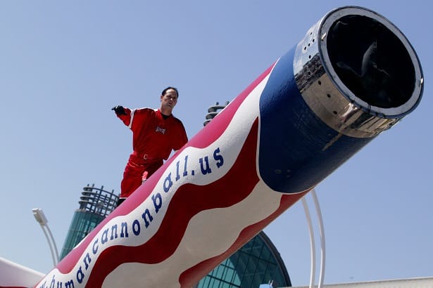 TORONTO-Ontario-August05-HUMAN-CANNONBALL-David-the-Bullet-Smith-on-the-barrel-of-his-cannon-chatting-to-the-crowd-and-posing-before-his-launch-photo-by-Norm-Betts-for-RexFeatures-416-460-8743-normbetts@canadianphotographer.com