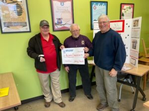 Maynard Johnson, Steamboat Days Past President presents a check for $2000.00 to Lions Club members Jack Krage and Jim Kreisel
